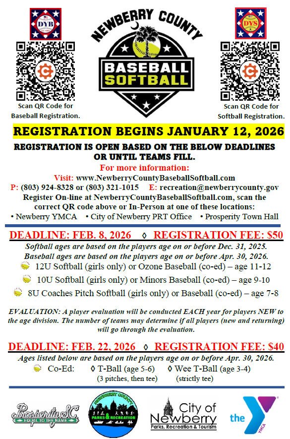 Registration can be completed at the following locations: Newberry County Family YMCA, Prosperity Town Hall, or City of Newberry Parks, Recreation & Tourism office or online once the registration period beings. Please do not hesitate to contact us if you have any questions (P: 803-924-8328 or E: recreation@newberrycounty.gov).